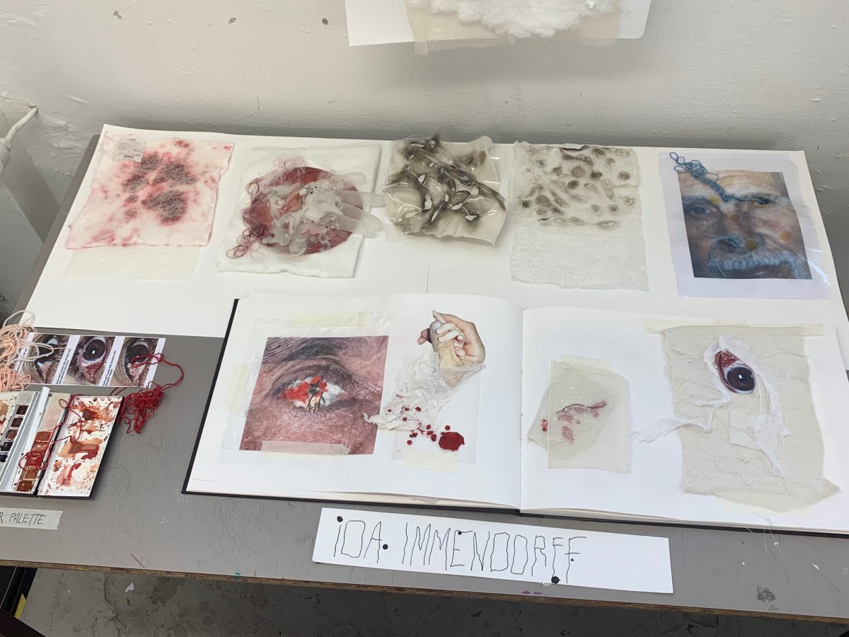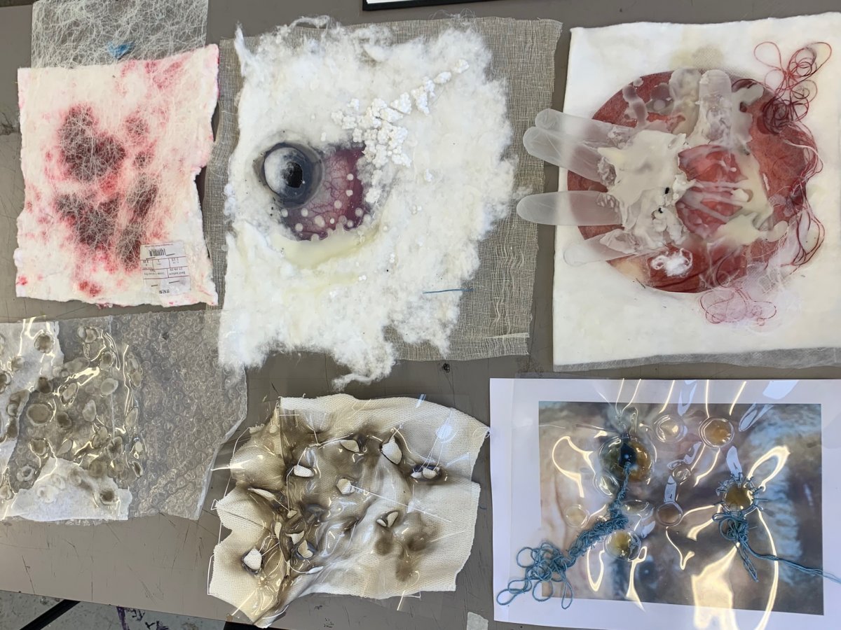 I was positively surprised by the the result of my sample and that they looked like textiles even used for most of them only glue to attach them, because I still have a lack in sewing. I tried to mix diverse materials that matched well with the different consistency of the eye and also the cataract phenomenon. I wished I had I little bit more time to experiment more and even try to really knit and sew different textiles together. I think though that I could have been more original on the way of displaying them and also how I presented them. I am definitely coming up with a different idea that will be more eye-catching next time.