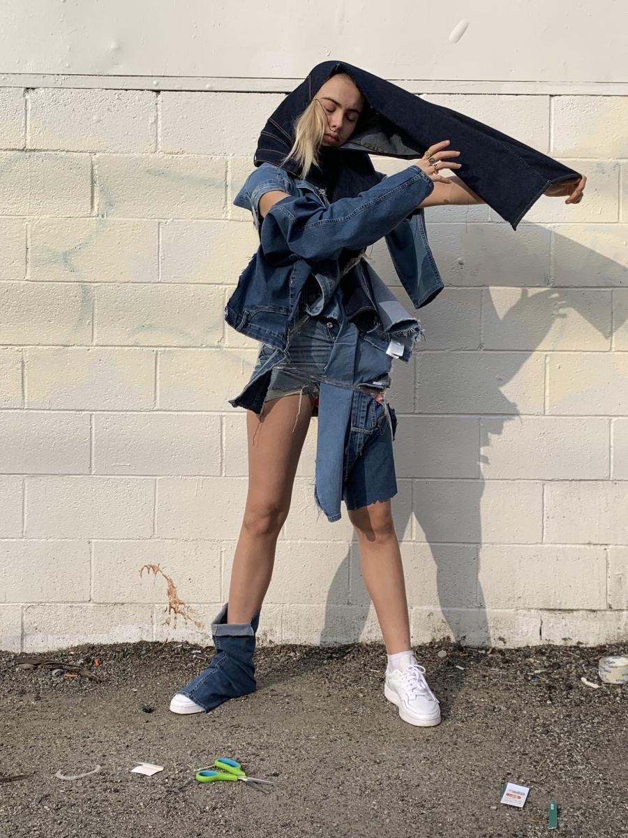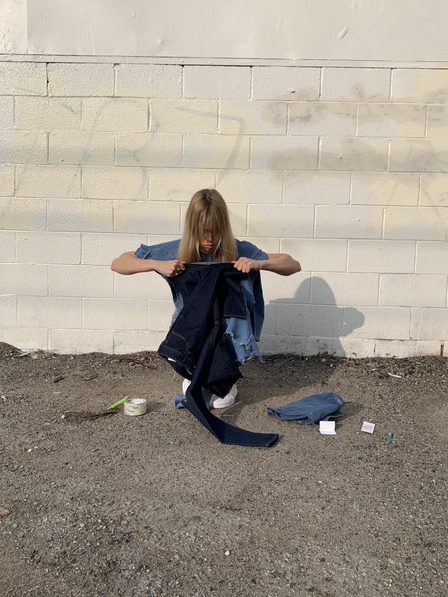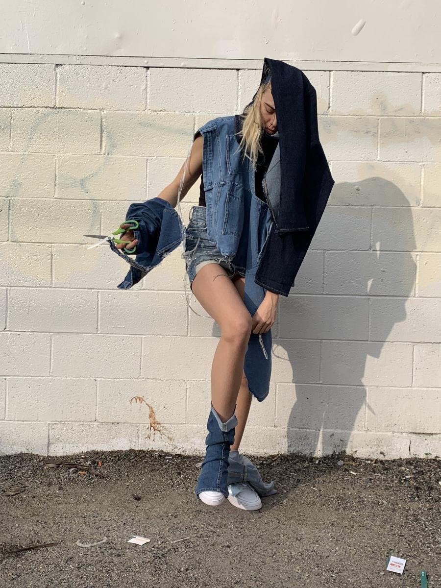 To start this project I decided to re-work on the deconstruction theme and use different kind of jeans or different shades to adapt myself with them by deconstructing them to an environment. I really wanted to put myself out there see where my limits are feel how it is when people stare you and you become ridiculous. I was interested in I would be perceived and started to behave as a new character I put myself into the role of this woman completely dressed with jeans that is ripped out of her hair and goes into a $.99 store just to see all the different things she could bye it has to do with someone can’t afford expensive clothes. And as denim is one of the cheapest fabrics you could have and buy you can find it anywhere and I wanted to put it over there and walk over the streets and become this new character. for the following days I will choose different spots in Los Angeles and adapt myself to environment and adapt the jeans and the denim to the environment make it something very chic transform it into something very brutal and from one end to the other from one extreme to the other I will try to transform this fabric this material that is already so much defined and has so much history I would like to transform it and make it in something new.