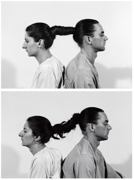 The performance 'Relation in Time' (October 1977) took place at Studio G7 in Bologna, Italy. Sitting quietly for seventeen hours, Abramovic and Ulay were connected to each other by means of their hair. They spent the first sixteen hours doing this alone, but visitors were allowed in to witness the final hour. The form of the performance 'Relation in Time' is sober, while the content is complex, a fusion of many ideas. Ulay and Abramovic are sitting in front of a white wall, their backs turned towards each other. Abramovic's hair, pulled back tightly into a ponytail, is tied to Ulay's ('Hair is a kind of antenna, like air roots of trees'). The spectator sees them in profile, each looking in a different direction. At the start of the seventeen-hour marathon, the