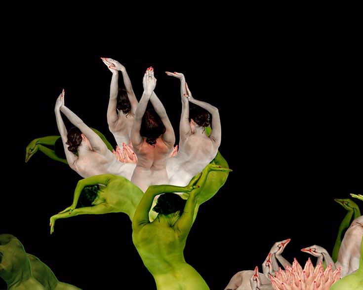 This is what Colonna says about the seven nymphs: They then transformed themselves into green trees of transparent emerald, covered with bright blue flowers, which bowed devoutly to the high god. The last one was entirely turned to a tree, her feet becoming roots; the next, all but her feet; the third, all but the part from the waist to the arms; and so on, successively. But the tops of the virginal heads showed that the metamorphosis would happen to each in turn. (Colonna 1999: 174)