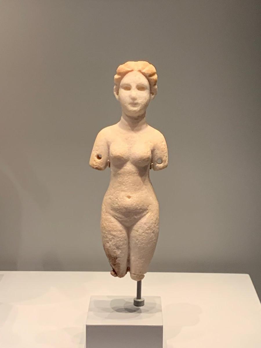 This figure's hollow eyes were probably once filled with colored glass, and the drill earlobes held earrings. It probably was also painted, but what I find intriguing is that I find this version of it, completely destructed by time and colorless, leaving us perceive the white granulated and brutal marble, much better then the older and painted version. I love her hips, her destructed arms and the loss of her legs and the whole in her eyes. the beauty in these sculptures are their imperfections created threw time.